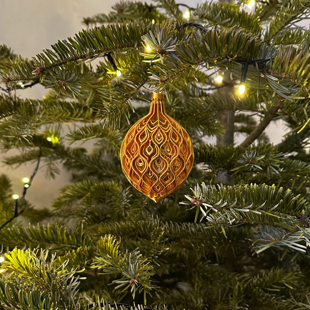 Tato originální vánoční baňka není jen dekorací – je symbolem elegance a originality. Vyrobená pomocí 3D tisku z kvalitního materiálu PLA Silk se pyšní velikostí 12,5 x 7,5 cm. Díky této technologii má každá ozdoba strukturovaný povrch, který je charakteristický pro tento výrobní proces.