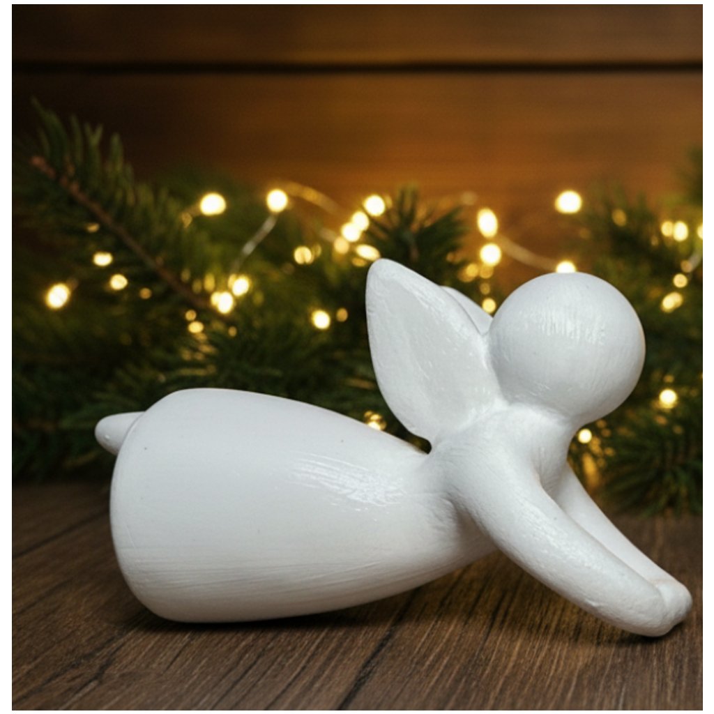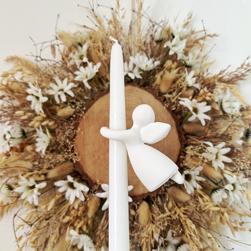 Svým jemným objímáním svíčky působí symbolicky i hřejivě – jako strážný anděl světla.